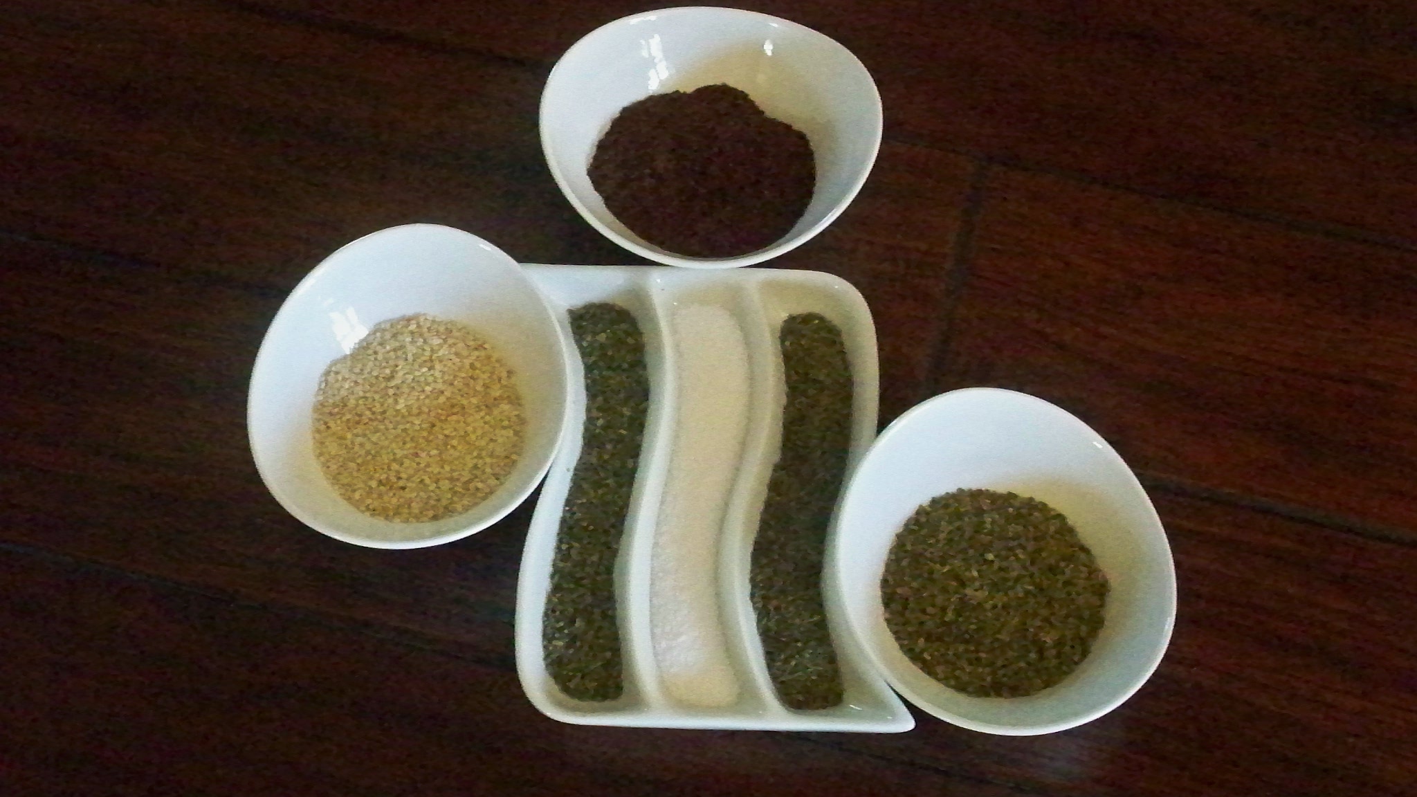 In a pan, lightly roast sesame seeds until they are light brown. To a mortar, add all spices including sesame seeds and salt and grind them down with a pestle. The consistency should be slightly grainy, not powdery. Add the olive oil and mix to blend the spices.