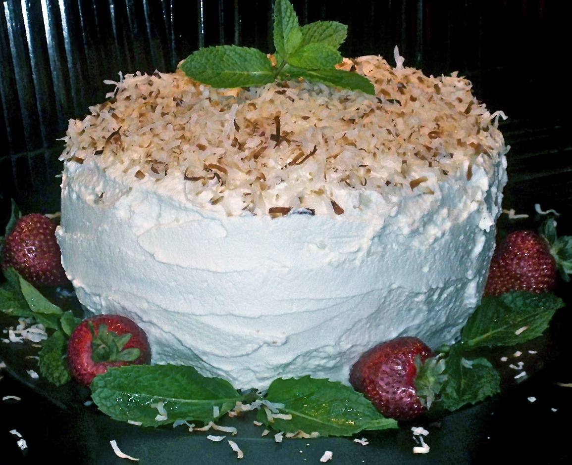 strawberries, and then a layer of bananas on top of the whipped cream. Place the second layer of cake on top of the fruit. Frost the layer and proceed with layering the fruit. Put the final layer of cake on top of the fruit and frost the entire cake. Finally, sprinkle the top of the cake with the toasted coconut flakes. Garnish the bottom of the cake and cake dish with strawberries, fresh mint leaves and toasted coconut flakes.