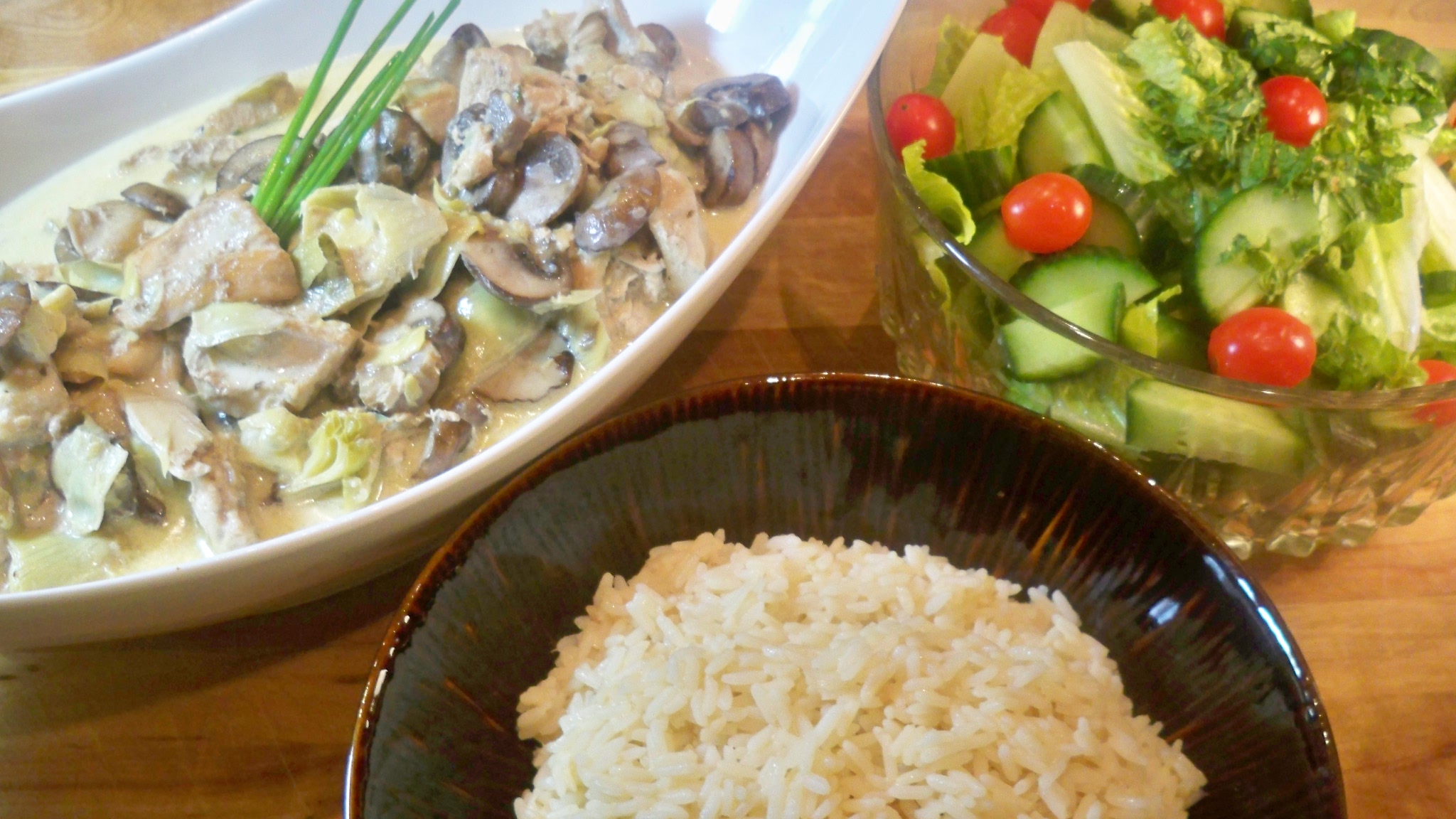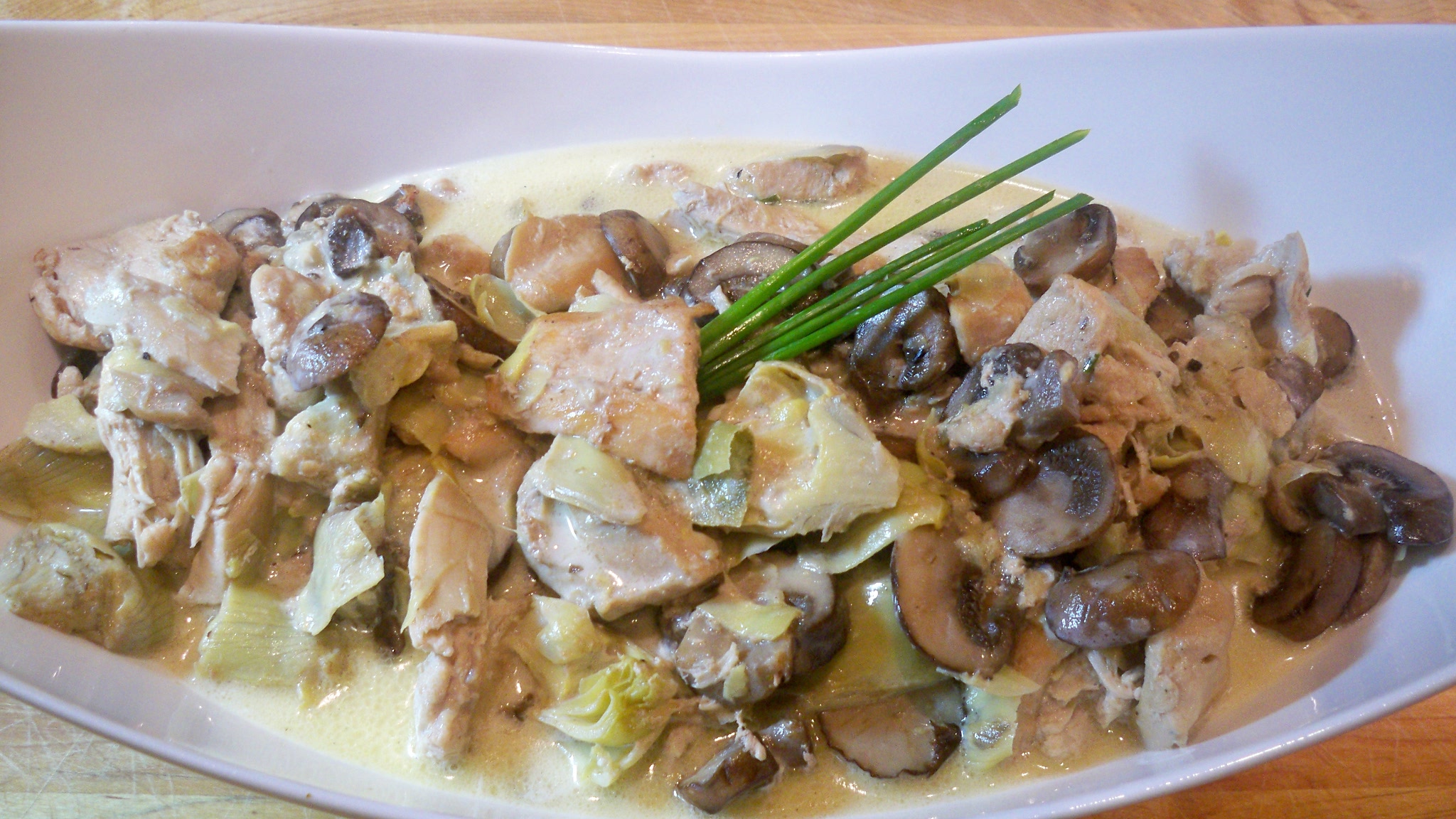 This is called Chicken Jerusalem for the Jerusalem Artichokes.  These particular artichokes look more like a tuber and do not grow here in the states.  The globe artichoke makes an excellent substitute.