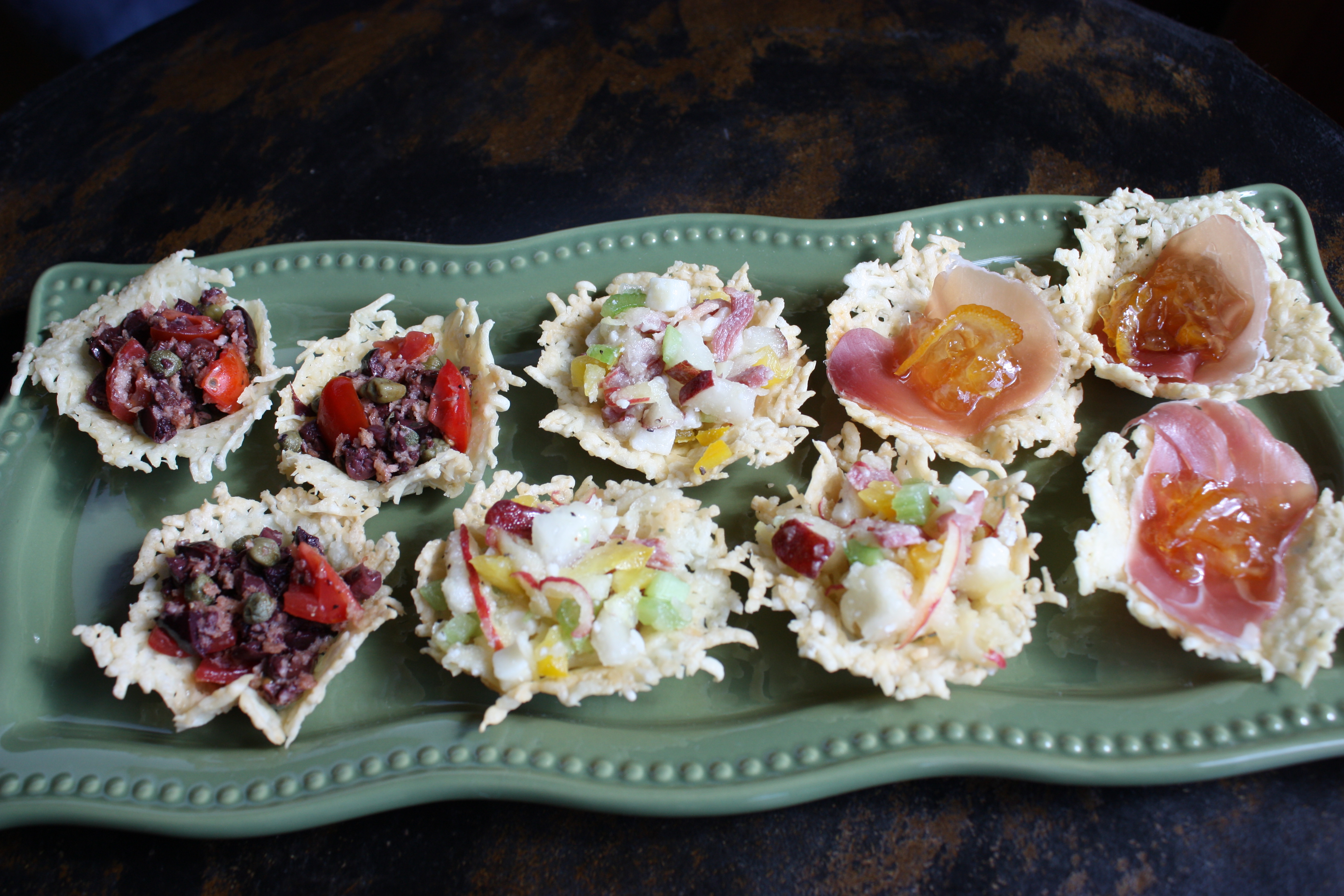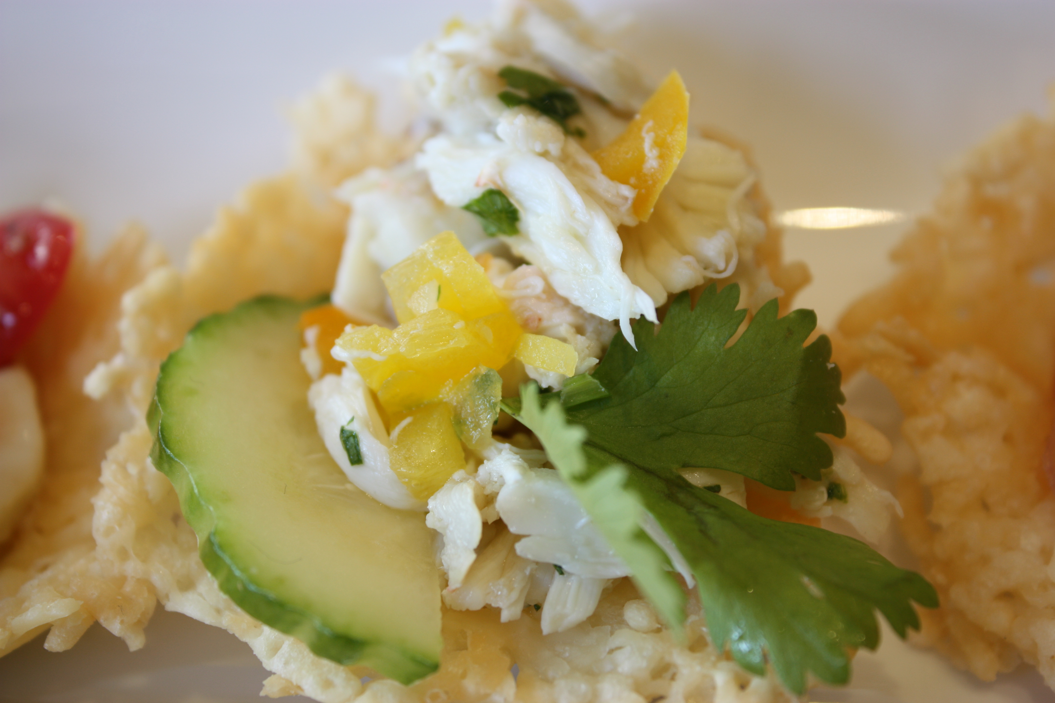 I love the Parmesan baskets!! yummmm, my favorite Caprese & Crab Ceviche’. Great job you two! 🙂