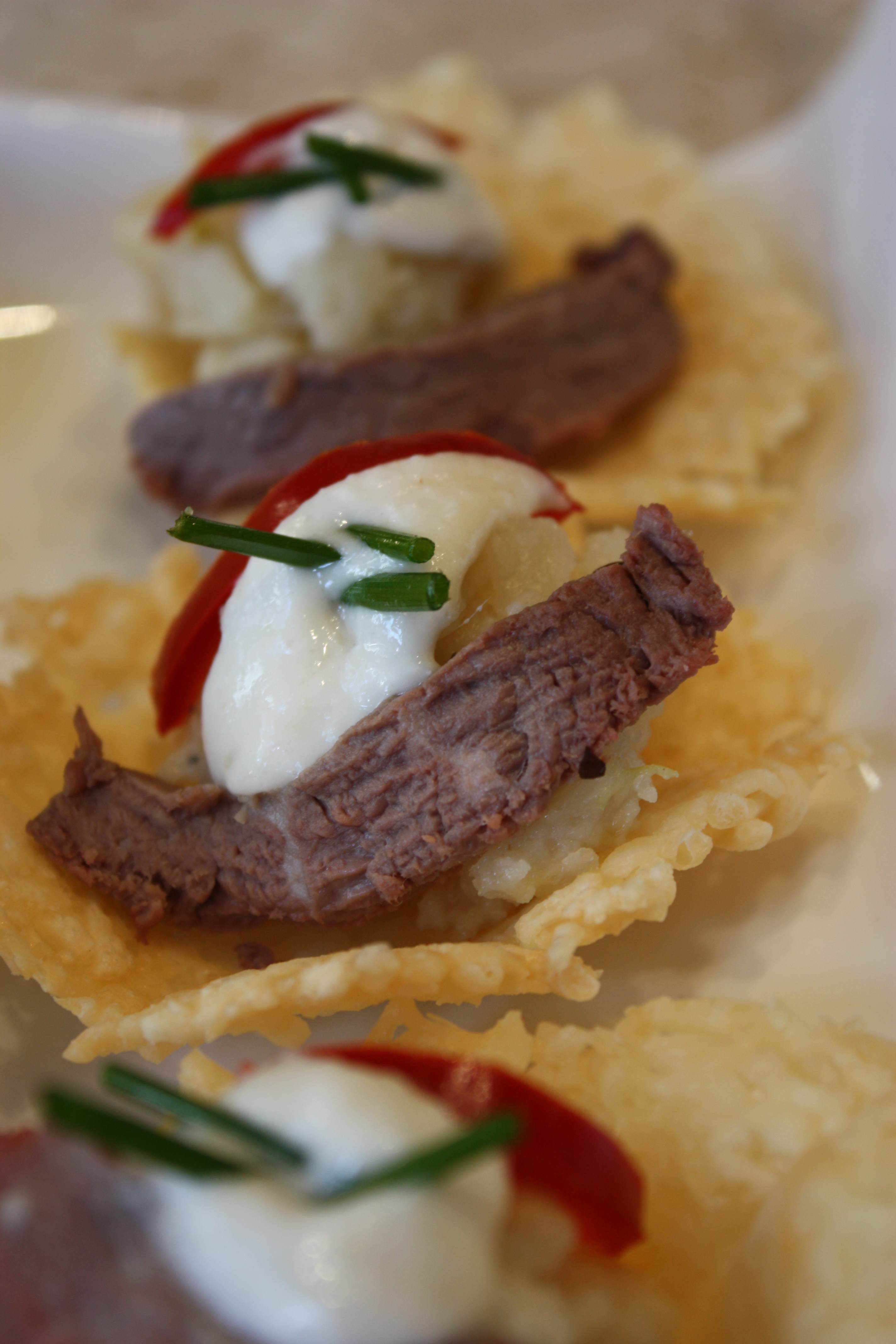 Place one heaping tablespoon of mashed potatoes in the basket. Add one slice of steak and one slivered bell pepper. Add one dollop of horseradish on top and gently place chopped chives into the horseradish.