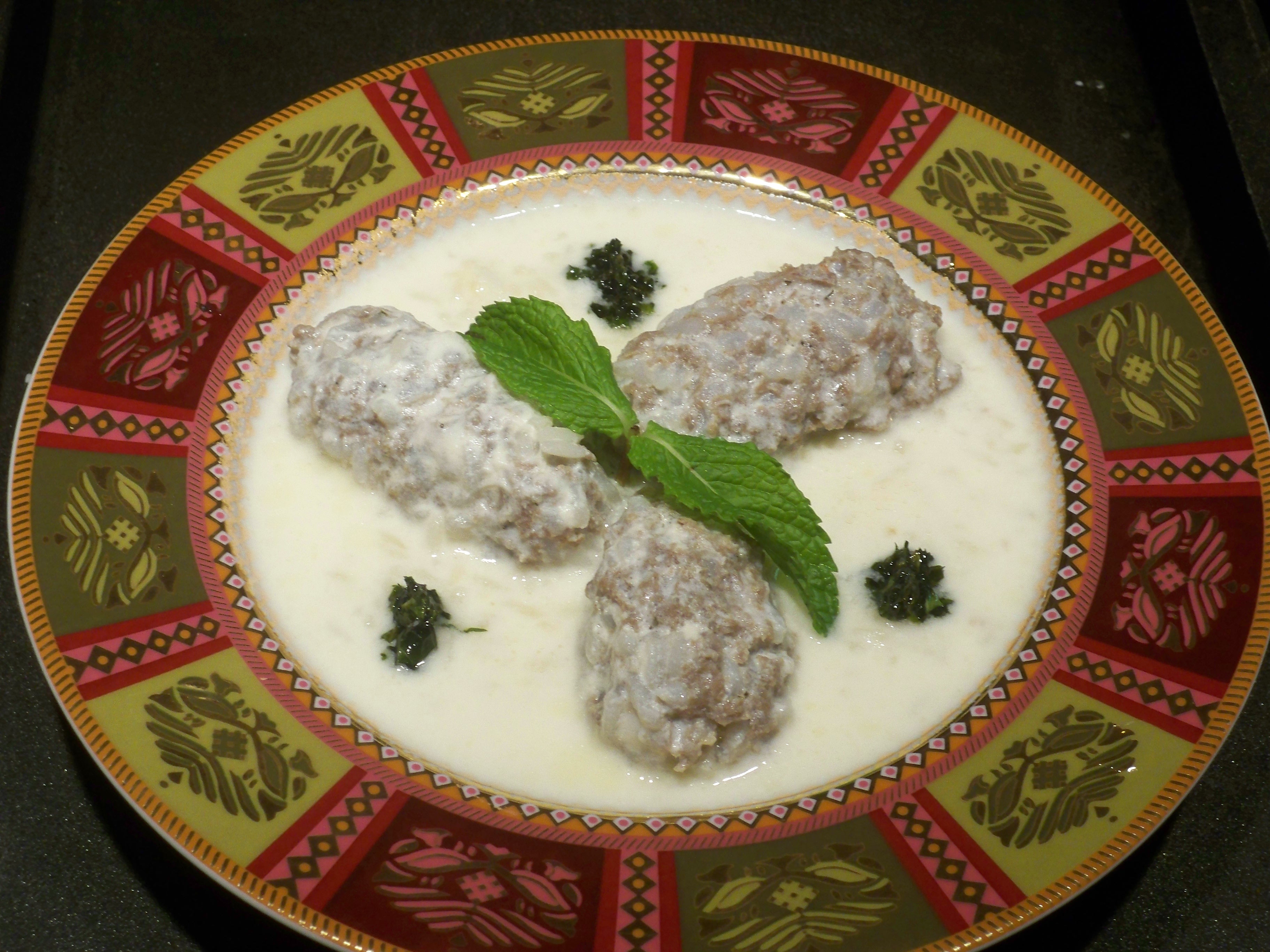 In a large pot, add yogurt, water and egg and whisk over low heat.  Add rice and salt. When it comes to a slow rolling boil, add the frozen kibbe balls and cook on low for about 20-30 minutes. Do not cook with the top on the pot or the soup may curdle.  Garnish with fried, salted mint. Serves 6.