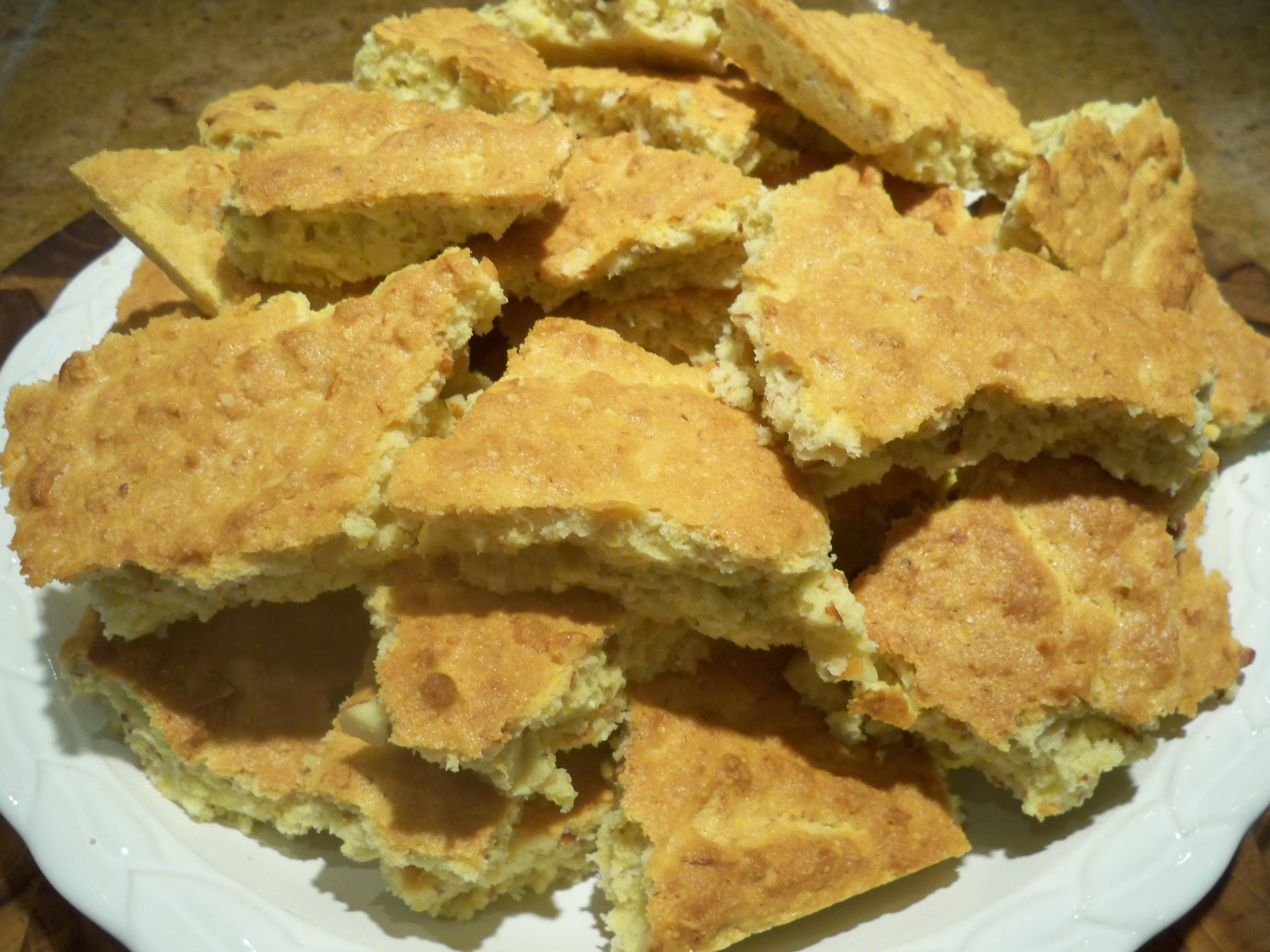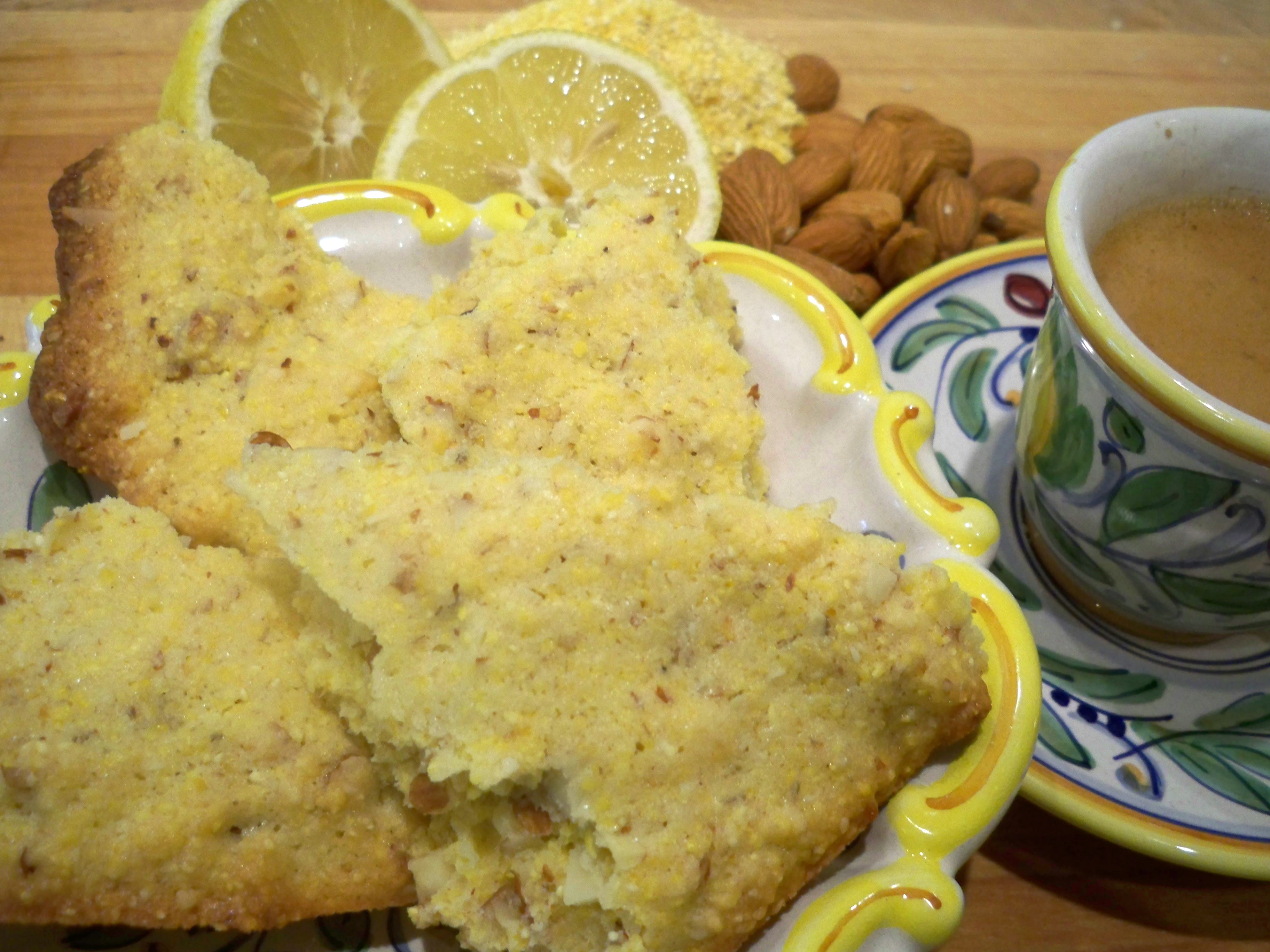 Preheat oven to 375 degrees. This recipe is best if mixed by hand. The less air in the batter, the better. In a mixing bowl, cream the butter and the sugar. Add the eggs one at a time. Blend in lemon zest and salt. Add flour , corn meal and almonds and mix until blended. On a 13×9 cookie sheet, spread out the batter, thinner for crispy cookies and thicker for more of a cakey cookie. Cook for 30-40 minutes or until the edges are browned. After the cookies have cooled enough to handle, break them into uneven, rustic looking pieces.