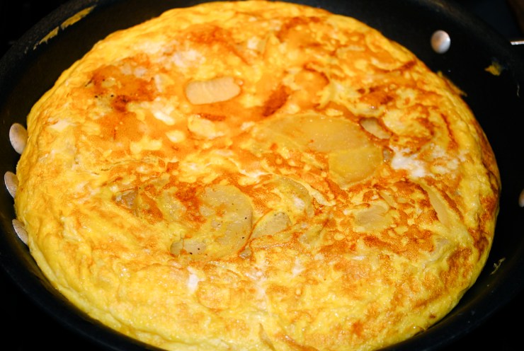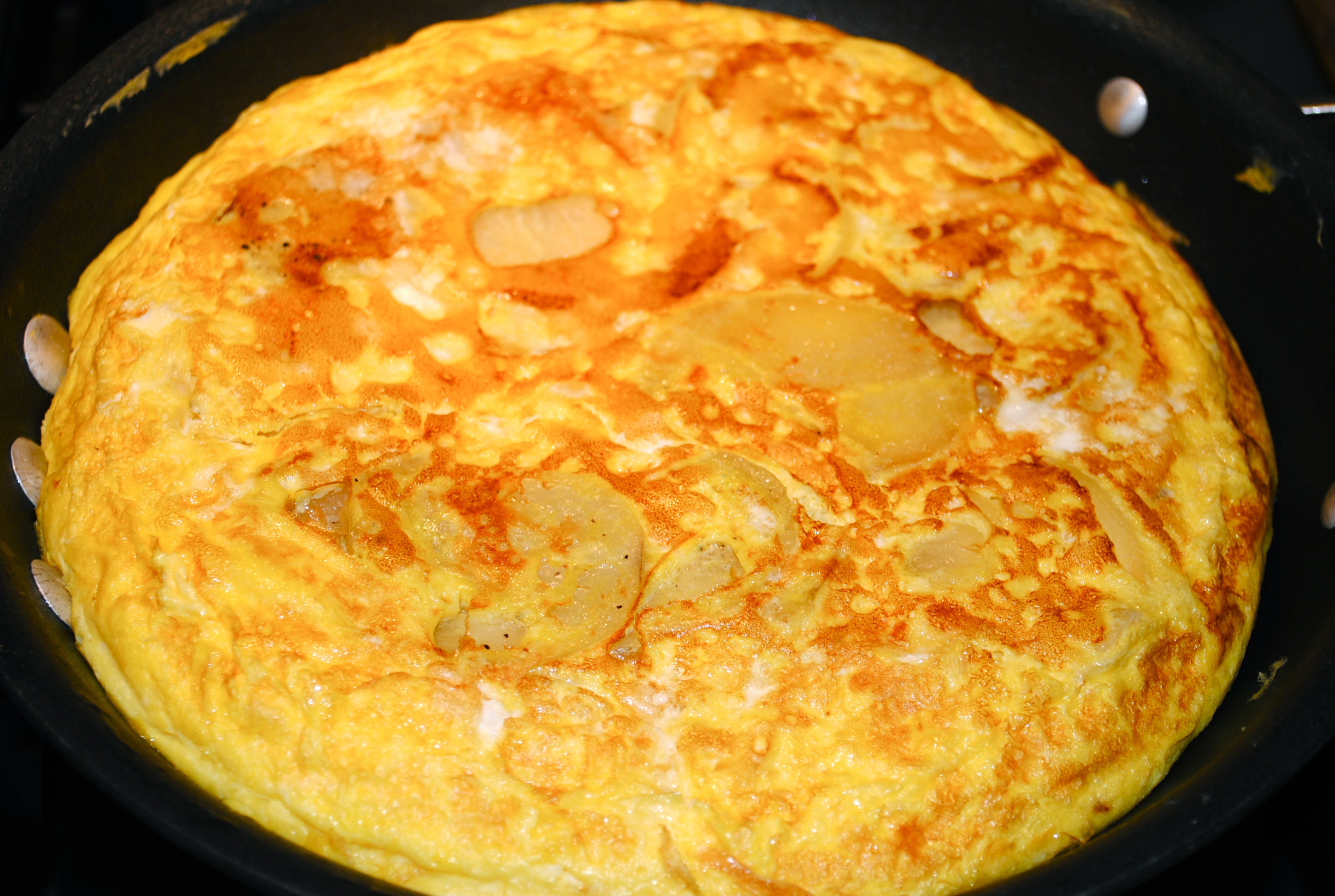 Place the second pan on top and flip the eggs so that the top is now on the bottom. Continue cooking until the bottom is nicely browned. You may have to flip it a couple times to make sure the tortilla is cooked all the way through. Serve warm or room temperature. Serves 6.