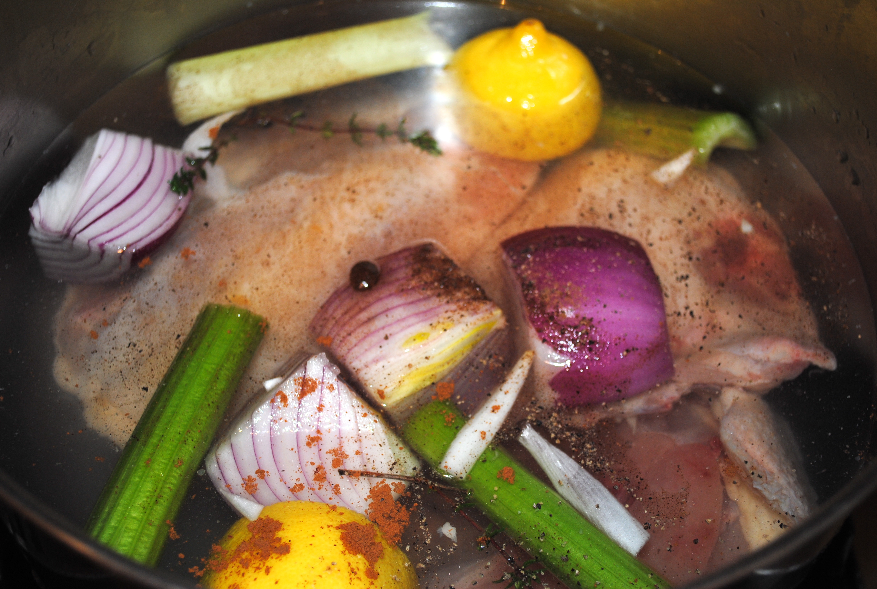 For the poached chicken, place the breasts in a pot and fill with about 6-8 cups of water or until the chicken is just covered.  Add the onion, celery, lemon, cinnamon, allspice and thyme.  Bring to a boil, then lower to a simmer for 5 minutes.  Turn the heat off and let the chicken sit in the hot water for 20 minutes.  Take the chicken out to cool and reserve the stock for the rice.