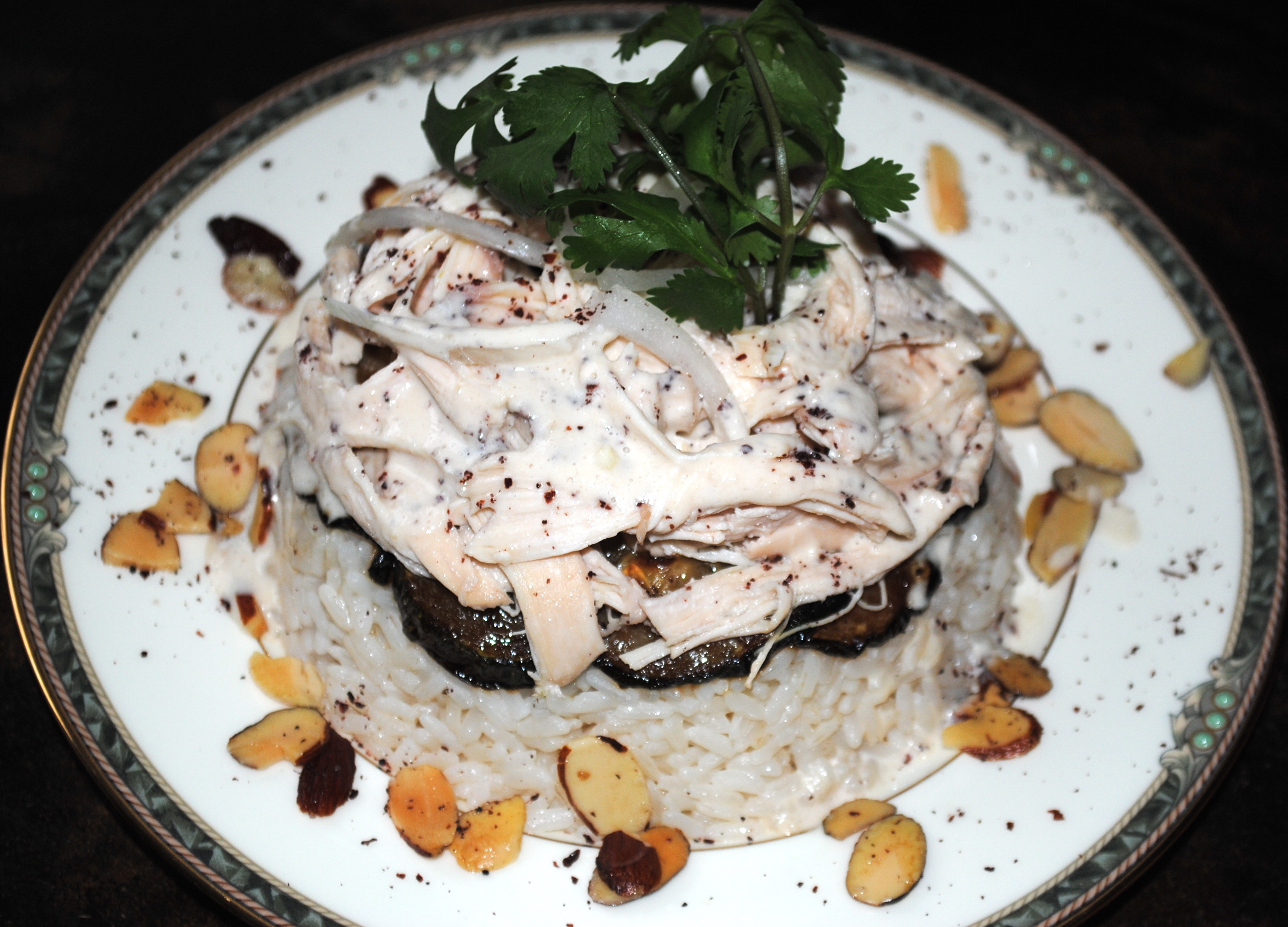 Finally, when the rice is done, take a deep bowl and lightly oil the inside.  Begin by placing the shredded chicken at the bottom, about 3/ 4 of the way up the sides.  Layer the eggplant on top of the rice.  Spoon the rice on top of the eggplant and pack it firmly.  Place the serving plate on top of the bowl and quickly turn it upside down.  The chicken and rice should come out perfectly formed.  Place the almonds around the plate.  Drizzle heavily with the tahini dressing.  Place the onions on top of the chicken and sprinkle on about 1/2 tsp. sumac per individual bowl.  Serves 6.