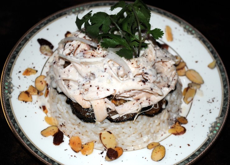 I made this dish today mostly from memory.  I know the chef used shredded turkey, but I had chicken on hand.  The tahini is also something I added because I have been trying this dish for years and have never been able to recreate the “sauce” if you will.  It was not laban or labne, although both would be delicious as well.  I also got a few ideas, like the eggplant, from Greg and Lucy Malouf’s, “Saha – a chef’s journey through Lebanon and Syria.”