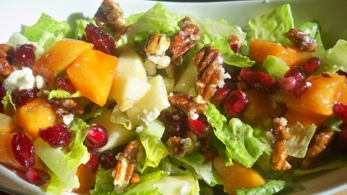 In a pan, roast the nuts with the sugar until they become caramelized. Set aside to cool. Wash all of the vegetables. Chop the romaine into bite-size pieces. Add the celery, green onions, apples and persimmons. Pour on the dressing and gently toss. Add the cheese and nuts last and give the salad a few gentle tosses. Serves 6.