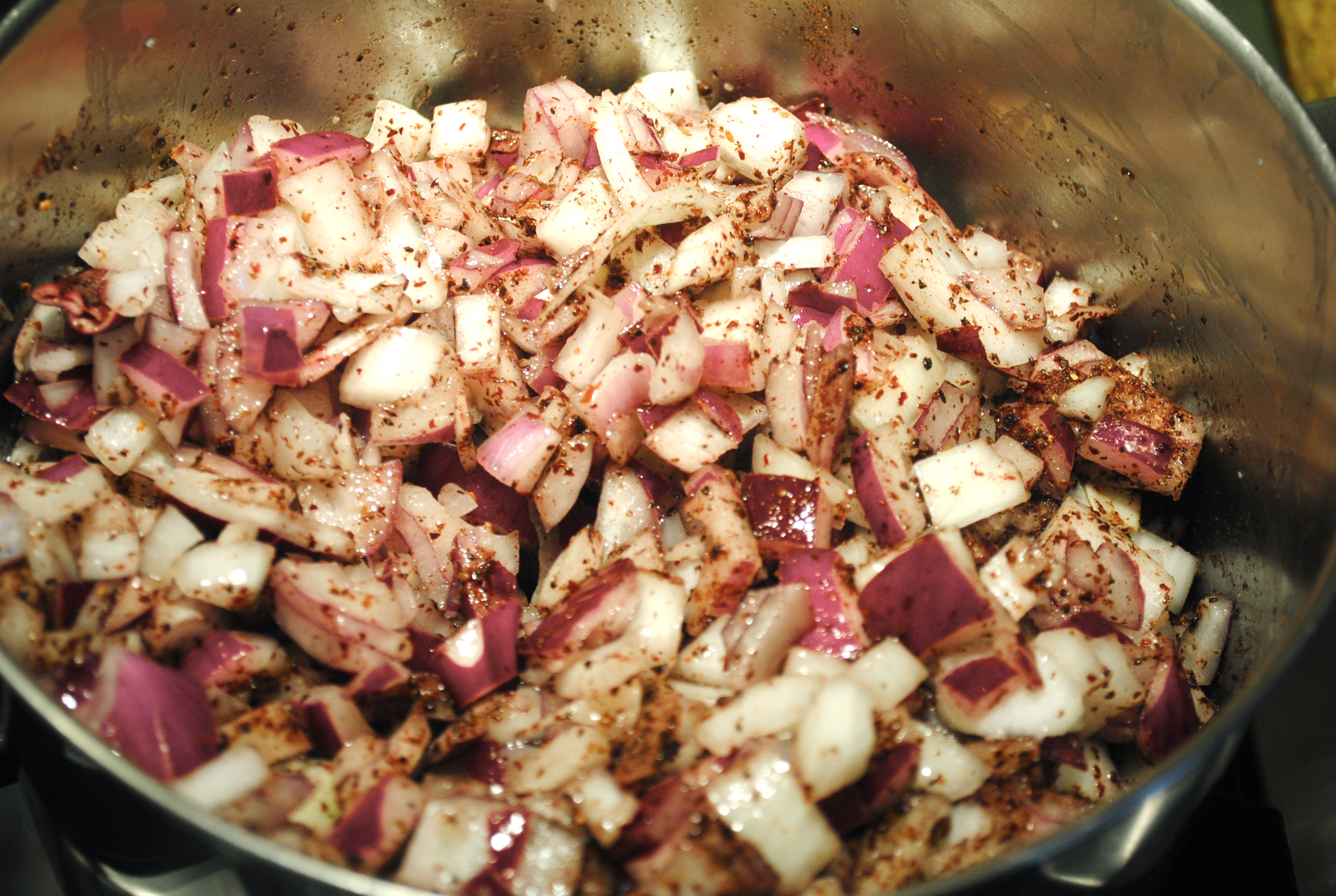 While chicken is cooking, place the chopped onions in a deep pan with the sumac and salt. Sauté in 1 1/2 cups of olive oil. Yes, that is a lot of oil but it is necessary for the right texture. Cook on medium low until the onions are caramelized. When done, take three-quarters of the onions and olive oil out of the pan and set aside.