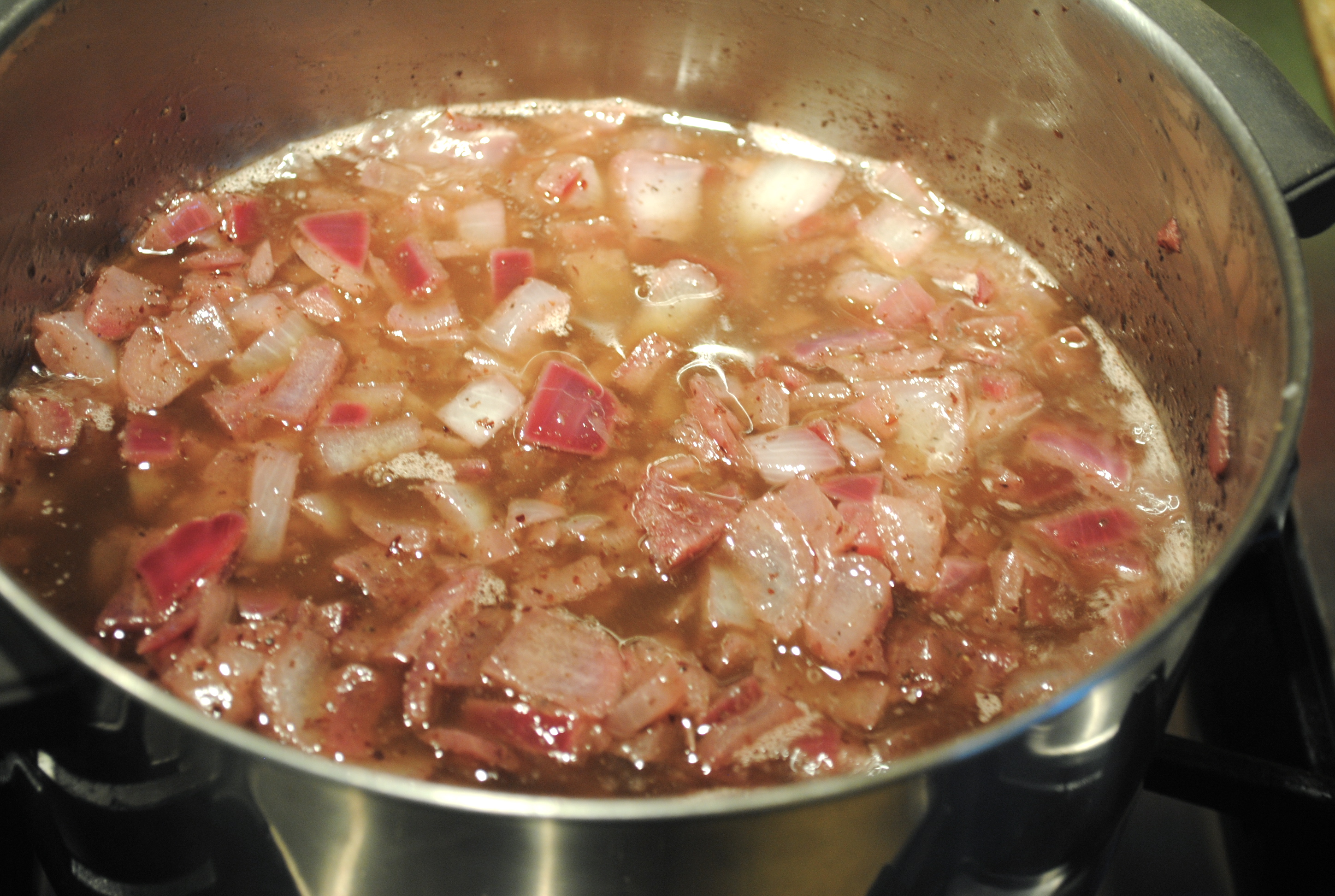 When the chicken is done, add three cups of the water / broth from the pot to the onions in the pan. Add 2 tsp. of salt as well.