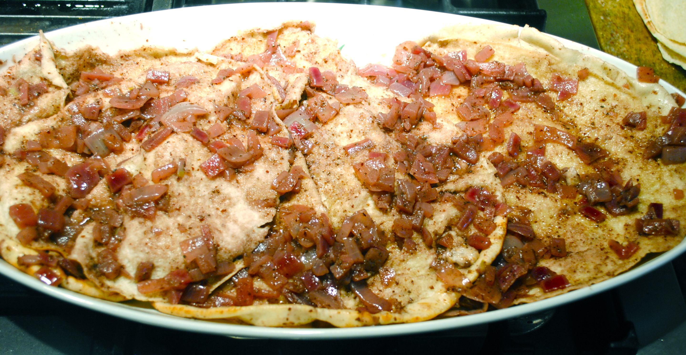 Place on the bottom of the oven-safe serving dish and top with some of the sautéed onions left over. Place in the oven on broil (middle rack) for three minutes. Take it out and put another layer of soaked bread with onions on top of the other. Place back in the oven for three minutes, Repeat one more time.