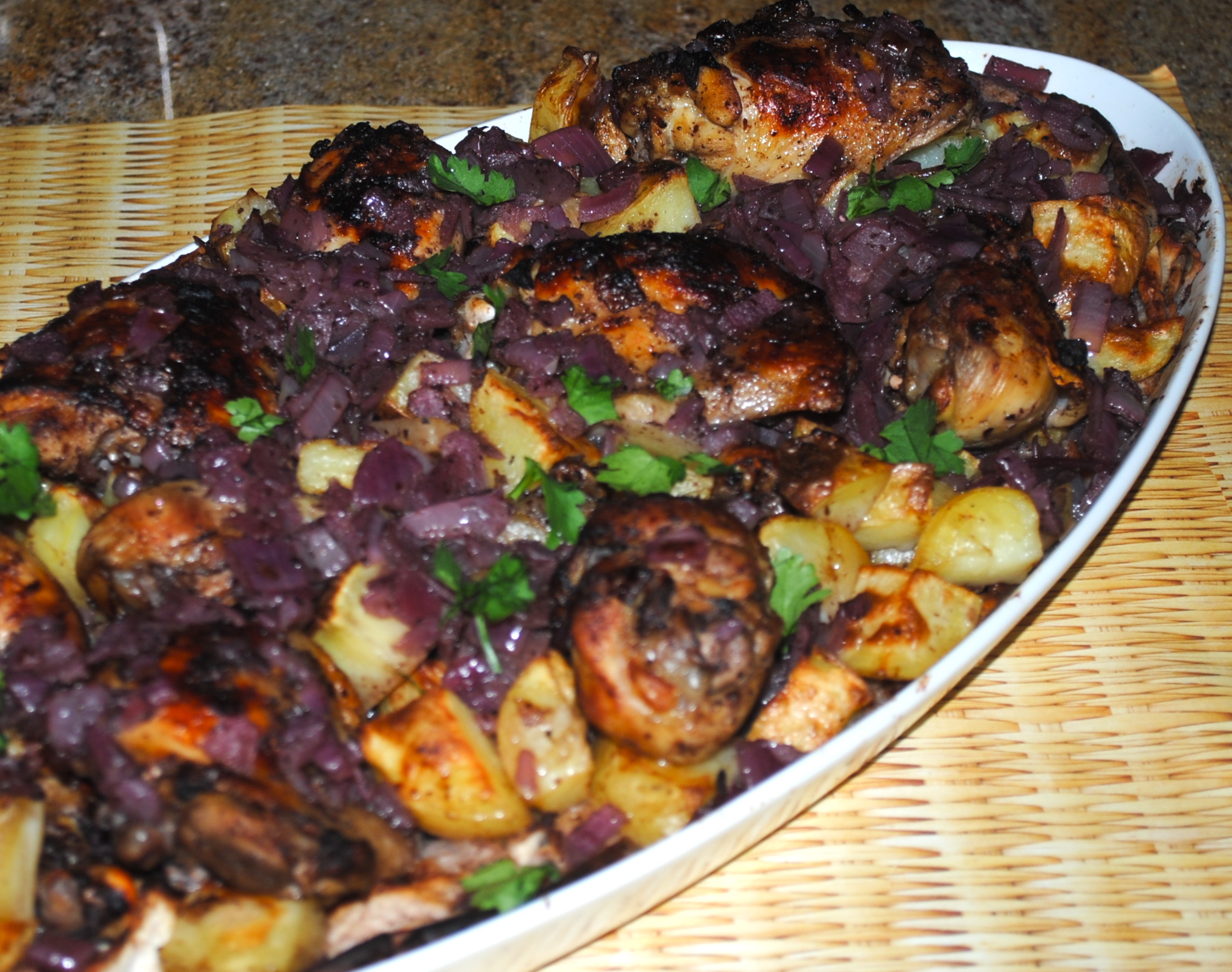 Place the chicken on the pan with the potatoes and coat with half of the onions and sumac set aside. Broil in the oven on high until golden brown.